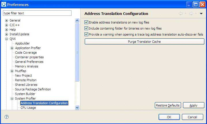 Address translation allows for the automatic discovery of library load addresses by analyzing the log file for events. By default, the Add Library dialog in the Address Translation dialog lets you specify that the library address should be discovered automatically. When kernel logging is used in conjunction with a C/C++ launch configuration and the Application Profiler tool, address translation for the generated kernel trace will have address translation information.
