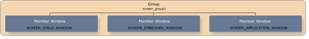 The name of the group should then be communicated to other functions, threads, or even processes that are responsible for creating the other windows that are to join this group. Any window can join this group as long as it has the associated group name. The owner is notified each time a window joins the group; a window handle is included in the event SCREEN_EVENT_CREATE.