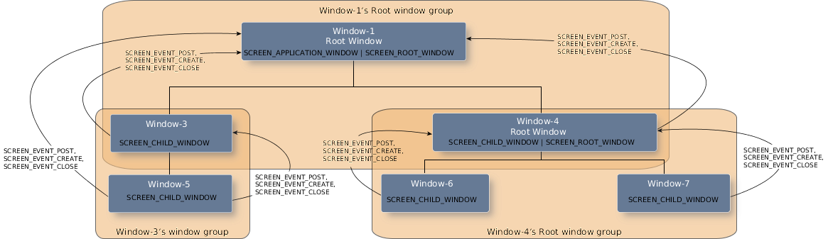Window-1 receives a SCREEN_EVENT_CREATE event when Window-5 joins the window group. However, Window-1 doesn't receive a SCREEN_EVENT_CREATE when Window-6 joins because Window-4 is a root window. The SCREEN_EVENT_CREATE event from Window-6 goes instead to Window-4 (similarly for Window-7).