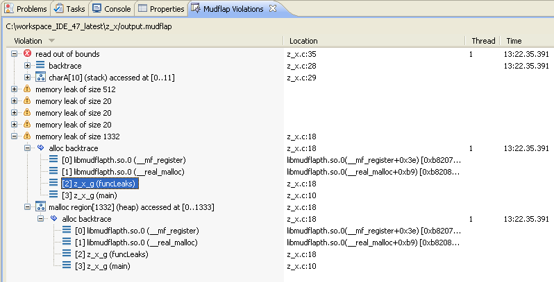 The IDE will populate the Mudflap Violations view with the contents of the Mudflap log file specified in the launch configuration. This provides you with additional information about the violation(s) that Mudflap detected.