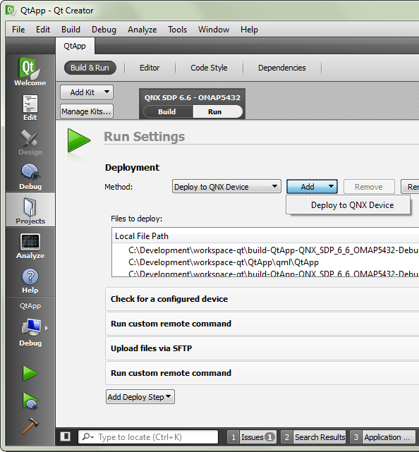 To deploy the BAR file and install the app, switch to Deploy to QNX Device before running the deployment step.