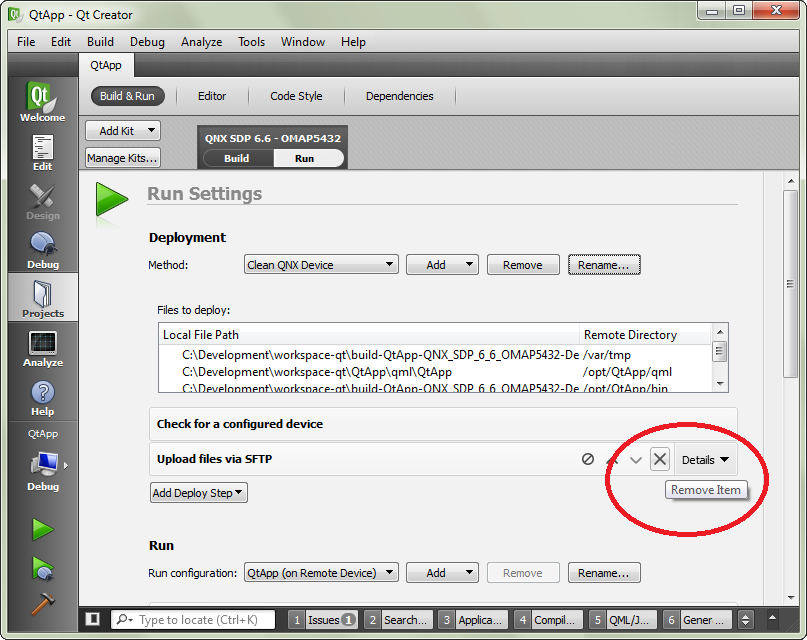 To clean the app's installation on the target, choose Clean QNX Device before redeploying the app.
