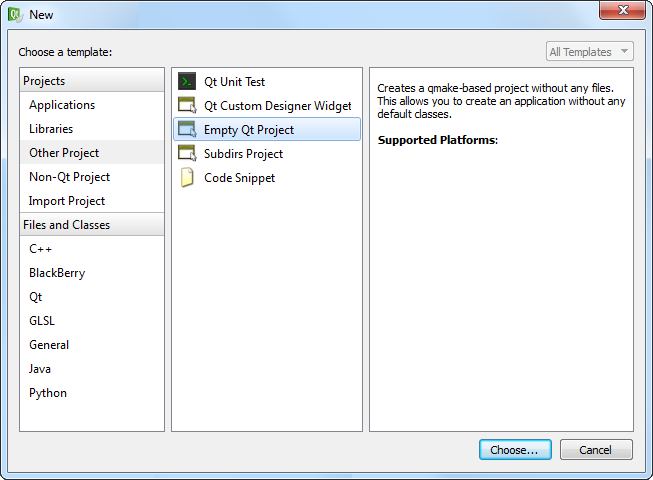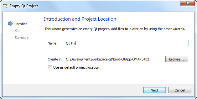 The first stage in writing a Qt HMI is to create a project in Qt Creator and add the files that define the UI, application