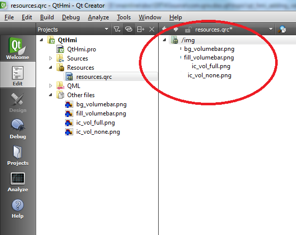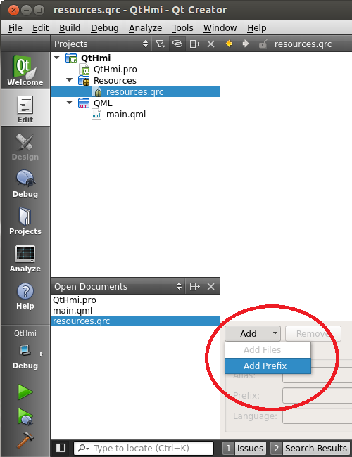 Open the resources.qrc file for editing, by right-clicking its entry in the