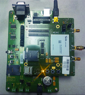 The picture above shows a Telit modem interface board with a connection (top right) leading out to a powered USB hub (not shown) for connecting to the main board's USB port (not shown).