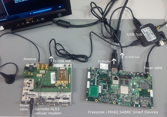 Figure 1. Freescale i.MX6Q SABRE Smart board, a powered USB hub, and a Gemalto ALS3-US cellular modem.