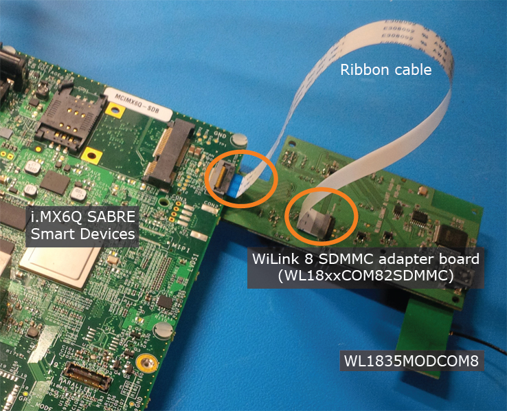 The image below shows an i.MX6Q SABRE Smart board connected to the WiLink 8 SDMMC adapter board