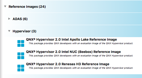 Figure 1. Hypervisor reference images in the QNX Software Center.The QNX Software Center will place the reference image in your QNX SDP 7.0 installation directory (e.g., ~/qnx700/targetImages/hypervisor/). It should contain a disk image file, which you will copy to your removable media and transfer to your target board to boot.
