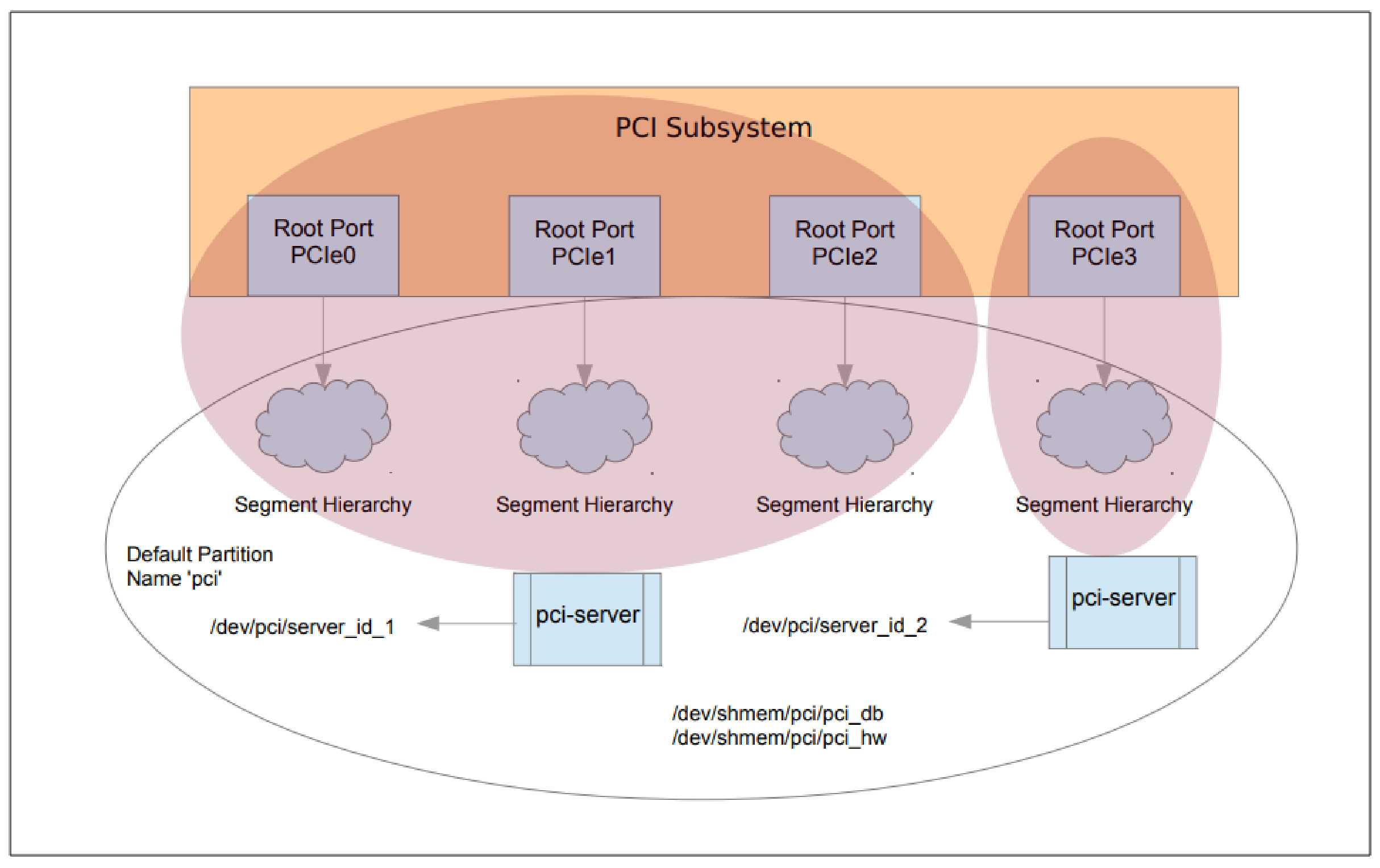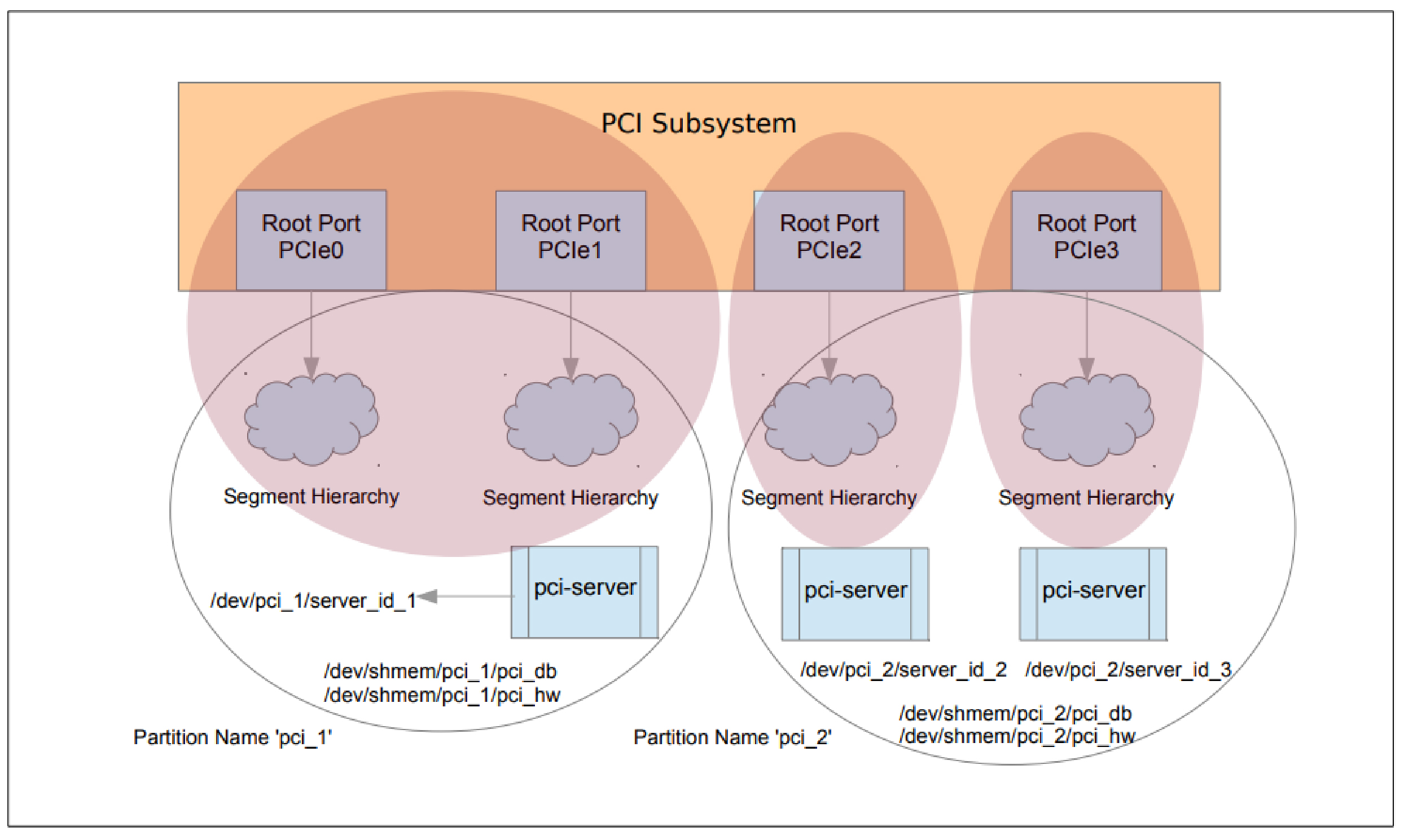 Two pci-server instances are used to manage the four segments but all four segments are part of the same, default partition and, as such share the same global BDF space: B[255..0]:D[31..0]:F[7..0].