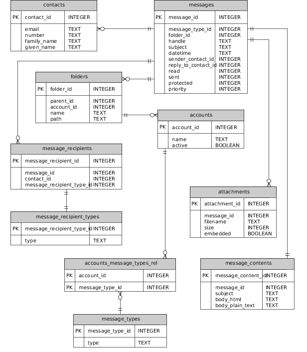 /* Turn foreign key constraints on */ PRAGMA foreign_keys = ON; /* Message types */ CREATE TABLE message_types ( message_type_id INTEGER PRIMARY KEY AUTOINCREMENT, type TEXT NOT NULL UNIQUE ); /* Accounts/Instances */ CREATE TABLE accounts ( account_id INTEGER PRIMARY KEY, name TEXT NOT NULL UNIQUE, active BOOLEAN NOT NULL ); /* Accounts/Instances */ CREATE TABLE accounts_message_types_rel ( account_id INTEGER NOT NULL REFERENCES accounts ON DELETE CASCADE, message_type_id INTEGER NOT NULL REFERENCES message_types, PRIMARY KEY (account_id, message_type_id) ); /* Folders */ CREATE TABLE folders ( folder_id INTEGER PRIMARY KEY AUTOINCREMENT, parent_id INTEGER REFERENCES folders ON DELETE CASCADE, account_id INTEGER NOT NULL REFERENCES accounts ON DELETE CASCADE, name TEXT NOT NULL, path TEXT NOT NULL, CHECK (parent_id <> folder_id) ); /* Messages (all types: email, sms, mms) */ CREATE TABLE messages ( message_id INTEGER PRIMARY KEY AUTOINCREMENT, message_type_id INTEGER NOT NULL REFERENCES message_types, folder_id INTEGER NOT NULL REFERENCES folders ON DELETE CASCADE, handle TEXT NOT NULL, subject TEXT NOT NULL, datetime TEXT NOT NULL, sender_contact_id INTEGER NOT NULL REFERENCES contacts(contact_id), reply_to_contact_id INTEGER REFERENCES contacts(contact_id), read INTEGER NOT NULL DEFAULT 0, sent INTEGER NOT NULL DEFAULT 0, protected INTEGER NOT NULL DEFAULT 0, priority INTEGER NOT NULL DEFAULT 0, CHECK (read = 0 OR read = 1), CHECK (sent = 0 OR sent = 1), CHECK (protected = 0 OR protected = 1), CHECK (priority = 0 OR priority = 1) ); /* Contacts (senders/recipients) */ CREATE TABLE contacts ( contact_id INTEGER PRIMARY KEY AUTOINCREMENT, email TEXT, number TEXT, family_name TEXT, given_name TEXT, CHECK(email IS NOT NULL OR number IS NOT NULL) ); /* Message contents */ CREATE TABLE message_contents ( message_content_id INTEGER PRIMARY KEY AUTOINCREMENT, message_id INTEGER NOT NULL REFERENCES messages ON DELETE CASCADE, subject TEXT , body_html TEXT , body_plain_text TEXT , CHECK (body_html IS NOT NULL OR body_plain_text IS NOT NULL) ); /* Message recipient types */ CREATE TABLE message_recipient_types ( message_recipient_type_id INTEGER PRIMARY KEY AUTOINCREMENT, type TEXT NOT NULL UNIQUE ); /* Message recipients */ CREATE TABLE message_recipients ( message_recipient_id INTEGER PRIMARY KEY AUTOINCREMENT, message_id INTEGER NOT NULL REFERENCES messages ON DELETE CASCADE, contact_id INTEGER NOT NULL REFERENCES contacts, message_recipient_type_id INTEGER NOT NULL REFERENCES message_recipient_types ); /* Attachments */ CREATE TABLE attachments ( attachment_id INTEGER PRIMARY KEY AUTOINCREMENT, message_id INTEGER NOT NULL REFERENCES messages ON DELETE CASCADE, filename TEXT NOT NULL, size INTEGER NOT NULL, embedded BOOLEAN NOT NULL ); /** VIEWS */ /* View to retrieve a list of brief messages */ CREATE VIEW "messages_view" AS SELECT accounts.account_id, accounts.name as account_name, messages.message_id, messages.folder_id, folders.name as folder_name, folders.path as folder_path, message_types.type, messages.handle, messages.subject, messages.datetime, messages.sender_contact_id, contacts_sender.email as sender_email, contacts_sender.number as sender_number, contacts_sender.family_name as sender_last_name, contacts_sender.given_name as sender_first_name, messages.reply_to_contact_id, contacts_reply.email as reply_to_email, contacts_reply.number as reply_to_number, contacts_reply.family_name as reply_to_last_name, contacts_reply.given_name as reply_to_first_name, messages.read, messages.sent, messages.protected, messages.priority, recipients.email as recipient_email, recipients.number as recipient_number, recipients.family_name as recipient_last_name, recipients.given_name as recipient_first_name FROM messages LEFT JOIN contacts contacts_sender ON messages.sender_contact_id = contacts_sender.contact_id LEFT JOIN contacts contacts_reply ON messages.reply_to_contact_id = contacts_reply.contact_id LEFT JOIN folders ON messages.folder_id = folders.folder_id LEFT JOIN accounts ON folders.account_id = accounts.account_id LEFT JOIN message_types ON messages.message_type_id = message_types.message_type_id LEFT JOIN contacts recipients ON recipients.contact_id = (SELECT contact_id FROM message_recipients WHERE message_recipients.message_id = messages.message_id AND message_recipients.message_recipient_type_id = 1 ORDER BY message_recipients.message_recipient_id DESC LIMIT 1); /* View to retrieve full messages */ CREATE VIEW "full_messages_view" AS SELECT accounts.account_id, accounts.name as account_name, messages.message_id, messages.folder_id, folders.name as folder_name, folders.path as folder_path, message_types.type, messages.handle, messages.datetime, messages.sender_contact_id, contacts_sender.email as sender_email, contacts_sender.number as sender_number, contacts_sender.family_name as sender_last_name, contacts_sender.given_name as sender_first_name, messages.reply_to_contact_id, contacts_reply.email as reply_to_email, contacts_reply.number as reply_to_number, contacts_reply.family_name as reply_to_last_name, contacts_reply.given_name as reply_to_first_name, messages.read, messages.sent, messages.protected, messages.priority, COALESCE(message_contents.subject, messages.subject) as subject, message_contents.body_plain_text, message_contents.body_html FROM messages LEFT JOIN message_contents ON messages.message_id = message_contents.message_id LEFT JOIN contacts contacts_sender ON messages.sender_contact_id = contacts_sender.contact_id LEFT JOIN contacts contacts_reply ON messages.reply_to_contact_id = contacts_reply.contact_id LEFT JOIN folders ON messages.folder_id = folders.folder_id LEFT JOIN accounts ON folders.account_id = accounts.account_id LEFT JOIN message_types ON messages.message_type_id = message_types.message_type_id WHERE message_contents.message_content_id IS NOT NULL; /* view to retrieve contacts */ CREATE VIEW "contacts_view" AS select contacts.contact_id, contacts.email, cont