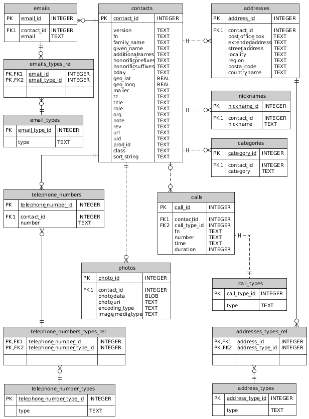 /* Turn foreign key constraints on */ PRAGMA foreign_keys = ON; /* Contacts */ CREATE TABLE contacts ( contact_id INTEGER PRIMARY KEY AUTOINCREMENT, version TEXT NOT NULL, fn TEXT NOT NULL, family_name TEXT NOT NULL, given_name TEXT NOT NULL, additional_names TEXT, honorific_prefixes TEXT, honorific_suffixes TEXT, sort_string TEXT, bday TEXT, geo_lat REAL, geo_long REAL, mailer TEXT, tz TEXT, title TEXT, role TEXT, org TEXT, note TEXT, rev TEXT, url TEXT, uid TEXT, prod_id TEXT, class TEXT ); /* Emails */ CREATE TABLE emails ( email_id INTEGER PRIMARY KEY AUTOINCREMENT, contact_id INTEGER NOT NULL REFERENCES contacts ON DELETE CASCADE, email TEXT NOT NULL ); CREATE TABLE email_types ( email_type_id INTEGER PRIMARY KEY AUTOINCREMENT, type TEXT NOT NULL UNIQUE ); CREATE TABLE emails_types_rel ( email_id INTEGER NOT NULL REFERENCES emails ON DELETE CASCADE, email_type_id INTEGER NOT NULL REFERENCES email_types ); /* Telephone numbers */ CREATE TABLE telephone_numbers ( telephone_number_id INTEGER PRIMARY KEY AUTOINCREMENT, contact_id INTEGER NOT NULL REFERENCES contacts ON DELETE CASCADE, number TEXT NOT NULL ); CREATE TABLE telephone_number_types ( telephone_number_type_id INTEGER PRIMARY KEY AUTOINCREMENT, type TEXT NOT NULL UNIQUE ); CREATE TABLE telephone_numbers_types_rel ( telephone_number_id INTEGER NOT NULL REFERENCES telephone_numbers ON DELETE CASCADE, telephone_number_type_id INTEGER NOT NULL REFERENCES telephone_number_types ); /* Addresses */ CREATE TABLE addresses ( address_id INTEGER PRIMARY KEY AUTOINCREMENT, contact_id INTEGER NOT NULL REFERENCES contacts ON DELETE CASCADE, post_office_box TEXT, extended_address TEXT, street_address TEXT, locality TEXT, region TEXT, postal_code TEXT, country_name TEXT ); CREATE TABLE address_types ( address_type_id INTEGER PRIMARY KEY AUTOINCREMENT, type TEXT NOT NULL UNIQUE ); CREATE TABLE addresses_types_rel ( address_id INTEGER NOT NULL REFERENCES addresses ON DELETE CASCADE, address_type_id INTEGER NOT NULL REFERENCES address_types ); /* Nicknames */ CREATE TABLE nicknames ( nickname_id INTEGER PRIMARY KEY AUTOINCREMENT, contact_id INTEGER NOT NULL REFERENCES contacts ON DELETE CASCADE, nickname TEXT NOT NULL ); /* Categories */ CREATE TABLE categories ( category_id INTEGER PRIMARY KEY AUTOINCREMENT, contact_id INTEGER NOT NULL REFERENCES contacts ON DELETE CASCADE, category TEXT NOT NULL ); /* Photos */ CREATE TABLE photos ( photo_id INTEGER PRIMARY KEY AUTOINCREMENT, contact_id INTEGER NOT NULL REFERENCES contacts ON DELETE CASCADE, photo_data BLOB, photo_uri TEXT, encoding_type TEXT, image_media_type TEXT ); /* Call Log */ CREATE TABLE calls ( call_id INTEGER PRIMARY KEY AUTOINCREMENT, contact_id INTEGER REFERENCES contacts ON DELETE SET NULL, call_type_id INTEGER NOT NULL REFERENCES call_types, fn TEXT, number TEXT, time TEXT NOT NULL, duration INTEGER ); CREATE TABLE call_types ( call_type_id INTEGER PRIMARY KEY AUTOINCREMENT, type TEXT ); /******** VIEWS ********/ CREATE VIEW emails_view AS SELECT emails.email_id, emails.contact_id, emails.email, MAX(CASE WHEN email_types.type = 'PREF' THEN 1 ELSE 0 END) AS pref, MAX(CASE WHEN email_types.type = 'INTERNET' THEN 1 ELSE 0 END) AS internet FROM emails LEFT JOIN emails_types_rel ON emails.email_id = emails_types_rel.email_id LEFT JOIN email_types ON emails_types_rel.email_type_id = email_types.email_type_id GROUP BY emails.email_id ORDER BY pref DESC, emails.email_id DESC; CREATE VIEW telephone_numbers_view AS SELECT telephone_numbers.telephone_number_id, telephone_numbers.contact_id, telephone_numbers.number, MAX(CASE WHEN telephone_number_types.type = 'PREF' THEN 1 ELSE 0 END) AS pref, MAX(CASE WHEN telephone_number_types.type = 'HOME' THEN 1 ELSE 0 END) AS home, MAX(CASE WHEN telephone_number_types.type = 'WORK' THEN 1 ELSE 0 END) AS work, MAX(CASE WHEN telephone_number_types.type = 'VOICE' THEN 1 ELSE 0 END) AS voice, MAX(CASE WHEN telephone_number_types.type = 'FAX' THEN 1 ELSE 0 END) AS fax, MAX(CASE WHEN telephone_number_types.type = 'MSG' THEN 1 ELSE 0 END) AS msg, MAX(CASE WHEN telephone_number_types.type = 'CELL' THEN 1 ELSE 0 END) AS cell, MAX(CASE WHEN telephone_number_types.type = 'PAGER' THEN 1 ELSE 0 END) AS pager, MAX(CASE WHEN telephone_number_types.type = 'BBS' THEN 1 ELSE 0 END) AS bbs, MAX(CASE WHEN telephone_number_types.type = 'MODEM' THEN 1 ELSE 0 END) AS modem, MAX(CASE WHEN telephone_number_types.type = 'CAR' THEN 1 ELSE 0 END) AS car, MAX(CASE WHEN telephone_number_types.type = 'ISDN' THEN 1 ELSE 0 END) AS isdn, MAX(CASE WHEN telephone_number_types.type = 'VIDEO' THEN 1 ELSE 0 END) AS video FROM telephone_numbers LEFT JOIN telephone_numbers_types_rel ON telephone_numbers.telephone_number_id = telephone_numbers_types_rel.telephone_number_id LEFT JOIN telephone_number_types ON telephone_numbers_types_rel.telephone_number_type_id = telephone_number_types.telephone_number_type_id GROUP BY telephone_numbers.telephone_number_id ORDER BY pref DESC, telephone_numbers.telephone_number_id DESC; CREATE VIEW addresses_view AS SELECT addresses.address_id, addresses.contact_id, addresses.post_office_box, addresses.extended_address, addresses.street_address, addresses.locality, addresses.region, addresses.postal_code, addresses.country_name, MAX(CASE WHEN address_types.type = 'PREF' THEN 1 ELSE 0 END) AS pref, MAX(CASE WHEN address_types.type = 'HOME' THEN 1 ELSE 0 END) AS home, MAX(CASE WHEN address_types.type = 'WORK' THEN 1 ELSE 0 END) AS work, MAX(CASE WHEN address_types.type = 'DOM' THEN 1 ELSE 0 END) AS dom, MAX(CASE WHEN address_types.type = 'INTL' THEN 1 ELSE 0 END) AS intl, MAX(CASE WHEN address_types.type = 'POSTAL' THEN 1 ELSE 0 END) AS postal, MAX(CASE WHEN address_types.type = 'PARCEL' THEN 1 ELSE 0 END) AS parcel FROM addresses LEFT JOIN addresses_types_rel ON addresses.address_id = addresses_types_rel.address_id LEFT JOIN address_types ON addresses_types_rel.address_type_id = address_types.address_type_id GROUP BY addresses.address_id ORDER BY pref DESC, addr