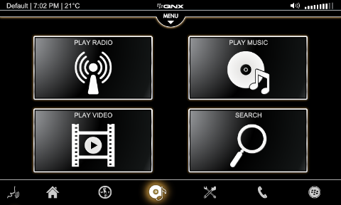 The Media Player screen displays the following controls for discovering and playing audio and video files on different sources: Play Radio, Play Music, Play Video, and Search.