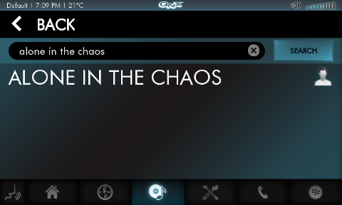 From the Media Player screen, tap the SEARCH button to access the search feature. The HMI shows a list of search sources, such as iPod, USB drive, or Juke Box. Tap the entry for the device you want to search. The HMI then shows a text field that lets you enter the name of an artist, album, or track.
