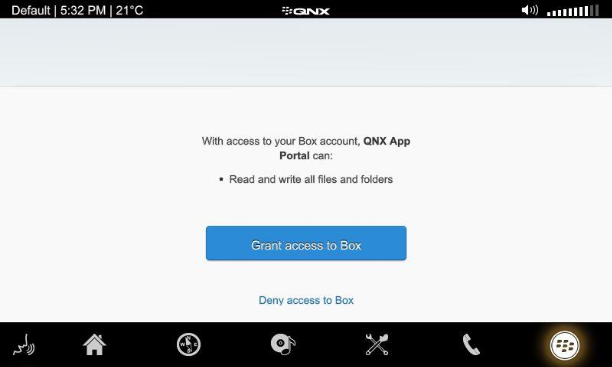 The QNX App Portal app then prompts you for permission to access your Box account's files and folders: