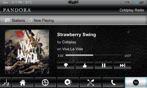 The Pandora Radio app is distributed with the QNX CAR platform. You can access a standalone version of the app (under the ALL category of the Apps Section screen) or an integrated version (through the Media Player).
