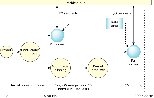 During the normal QNX Neutrino boot process, a driver process can't run until the OS image has been loaded into the RAM, and the kernel has been initialized. Depending on the particular hardware (processor, flash, architecture) and the OS image size, this time can be in the order of hundreds of milliseconds or even seconds. To reduce this time, a minidriver runs much earlier in the boot process to take care of the timing requirements for some bus protocols such as MOST or CAN.