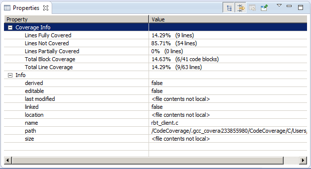 The Properties view, which is displayed in the lower left corner by default, shows a summary of the code coverage for the