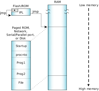 Let's look at the common characteristics. In such systems, the IPL code knows how to fetch data from some piece of hardware. The process is as follows: