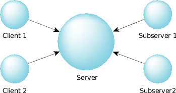 If you were doing a job like this, you'd start by hiring some extra employees. These employees would all come to you (just as the subservers send a message to the server—hence the note about the arrows in the diagram above), looking for work to do. Initially, you might not have any, so you wouldn't reply to their query. When someone comes into your office with a folder full of work, you say to one of your employees, "Here's some work for you to do." That employee then goes off and does the work. As other jobs come in, you'd delegate them to the other employees.