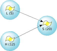This is true; a higher-priority thread will always preempt a lower-priority thread. But something interesting can happen. Let's look at a scenario where we have three threads (in three different processes, just to keep things simple), "L" is our low-priority thread, "H" is our high-priority thread, and "S" is a server. This diagram shows the three threads and their priorities: