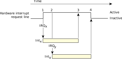 In the above scenario, if the PIC is operating in a level-sensitive mode, the IRQ is considered active whenever it's high. In this configuration, while the second assertion (step 2) doesn't itself cause a new interrupt, the interrupt is still considered active even when the original cause of the interrupt is removed (step 3). Not until the last assertion is cleared (step 4) will the interrupt be considered inactive.