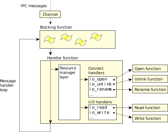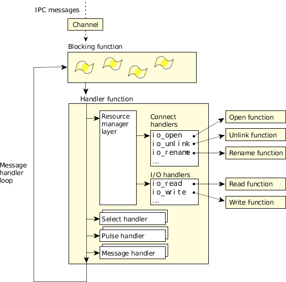 Figure 1. You can use the resmgr layer to handle _IO_* messages.This layer acts as a single blocking point for a number of different types of things. With this layer, you can handle: