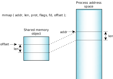 void * mmap( void *where_i_want_it, size_t length, int memory_protections, int mapping_flags, int fd, off_t offset_within_shared_memory );