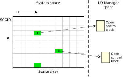 The following diagram shows an I/O manager taking some SCOID, FD pairs and mapping them to OCBs.