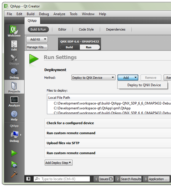 To deploy the BAR file and install the app, switch to Deploy to QNX Device before running the deployment step.