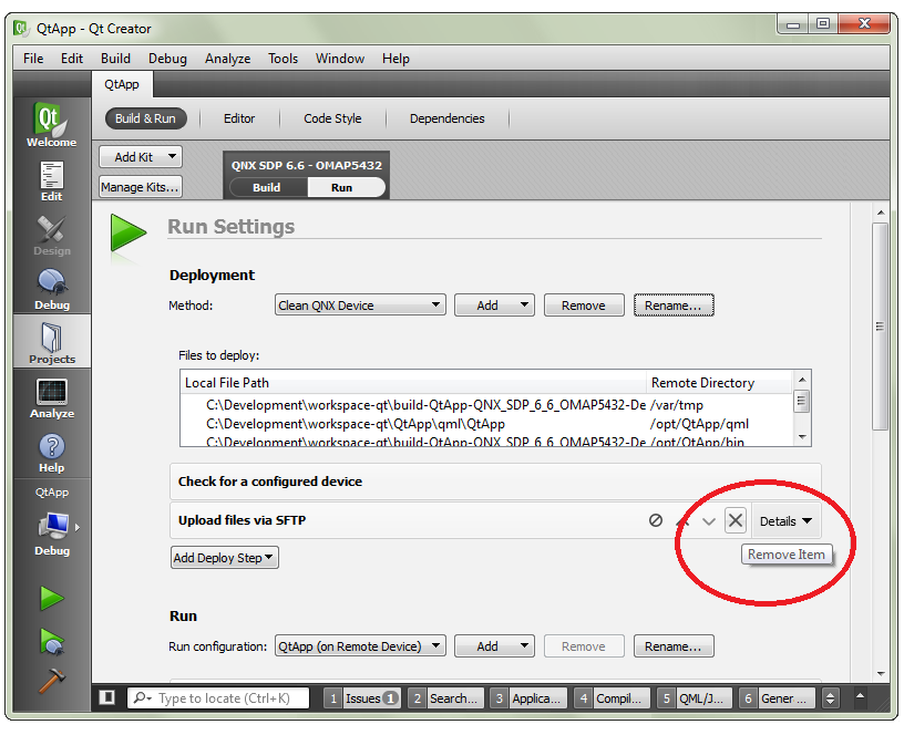 To clean the app's installation on the target, choose Clean QNX Device before redeploying the app.