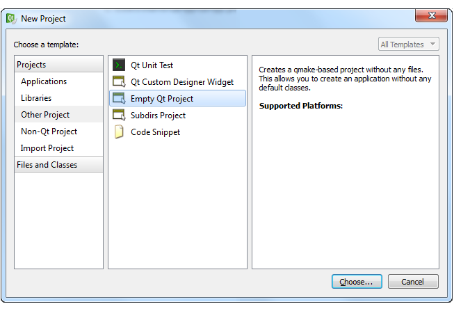 Qt Creator displays the Empty Qt Project configuration dialog.
