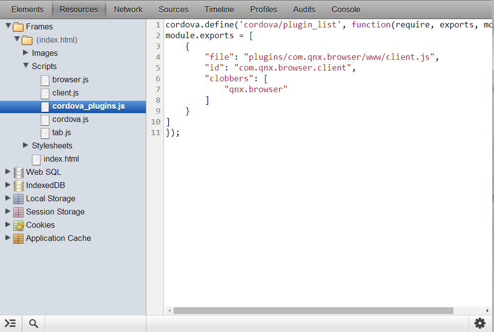 The Resources panel shows a complete list of the resources that the WebKit engine must request and load to render the webpage, as well as any client-side resources created and used by the webpage. You can also use the Resources panel to view the content of any resource file. Resources are organized in the panel as follows: