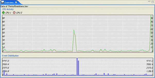 These charts display the CPU usage (per CPU) over time and the volume of events over time. The Overview reflects the current state of the active editor and active editor pane. You can select an area of interest in either one of the charts; then, using the right-click menu, zoom in to display only that range of events to quickly isolate areas of interest due to abnormal system activity.