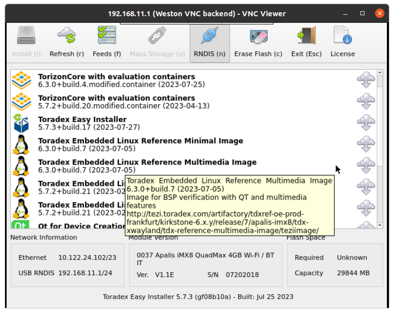 For detailed information on how to install an image, please see the Toradex website at https://developer.toradex.com/easy-installer/toradex-easy-installer/#detailed-manual.