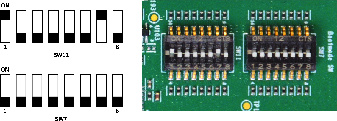 The following diagram shows how SW7 and SW11 should appear on the board: