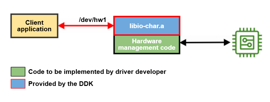 The io-char module provides a resource manager that handles client communication using hardware-specific functions implemented by the driver. This allows you to concentrate on the hardware interaction only.