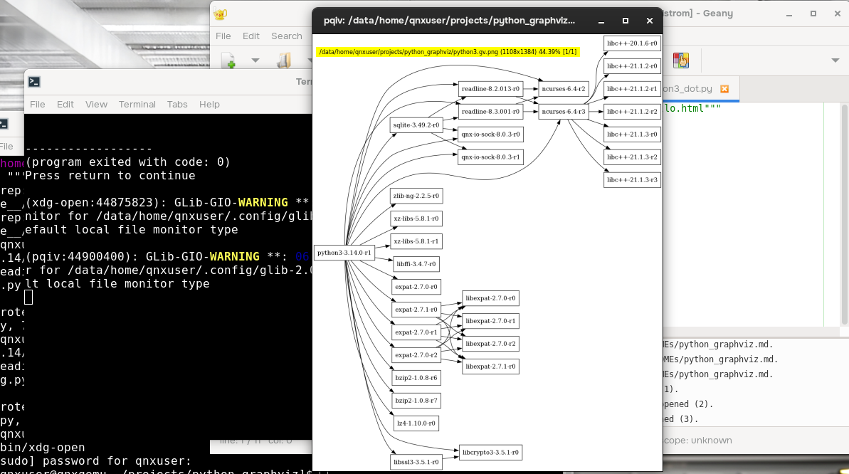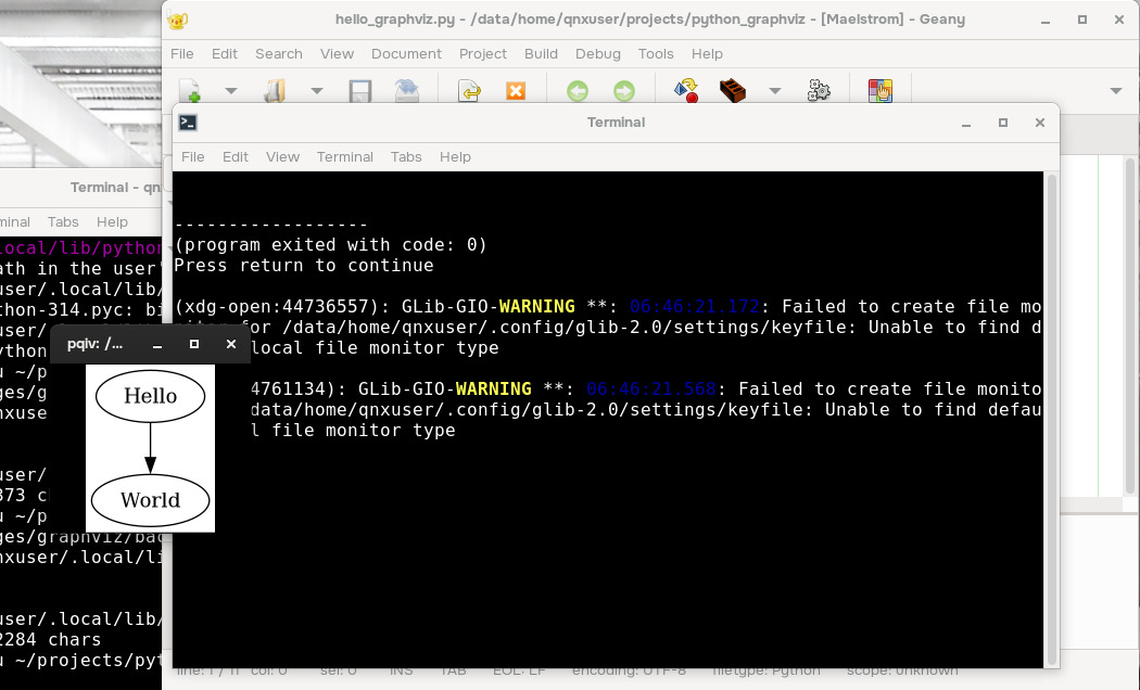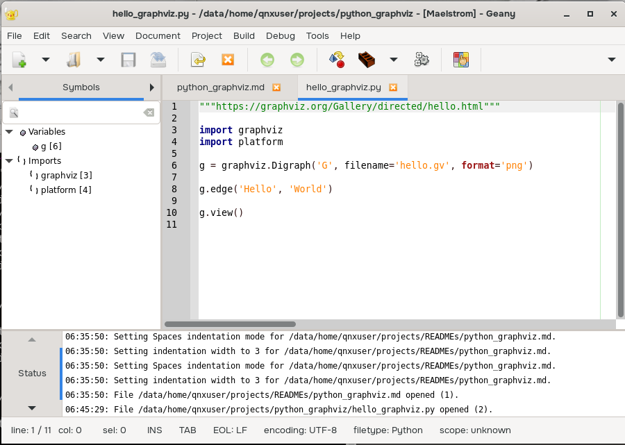 In Geany, open /home/qnxuser/projects/python_graphviz/hello_graphviz.py: