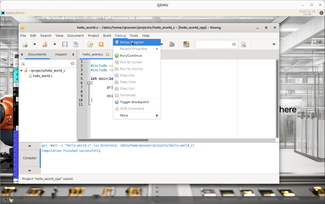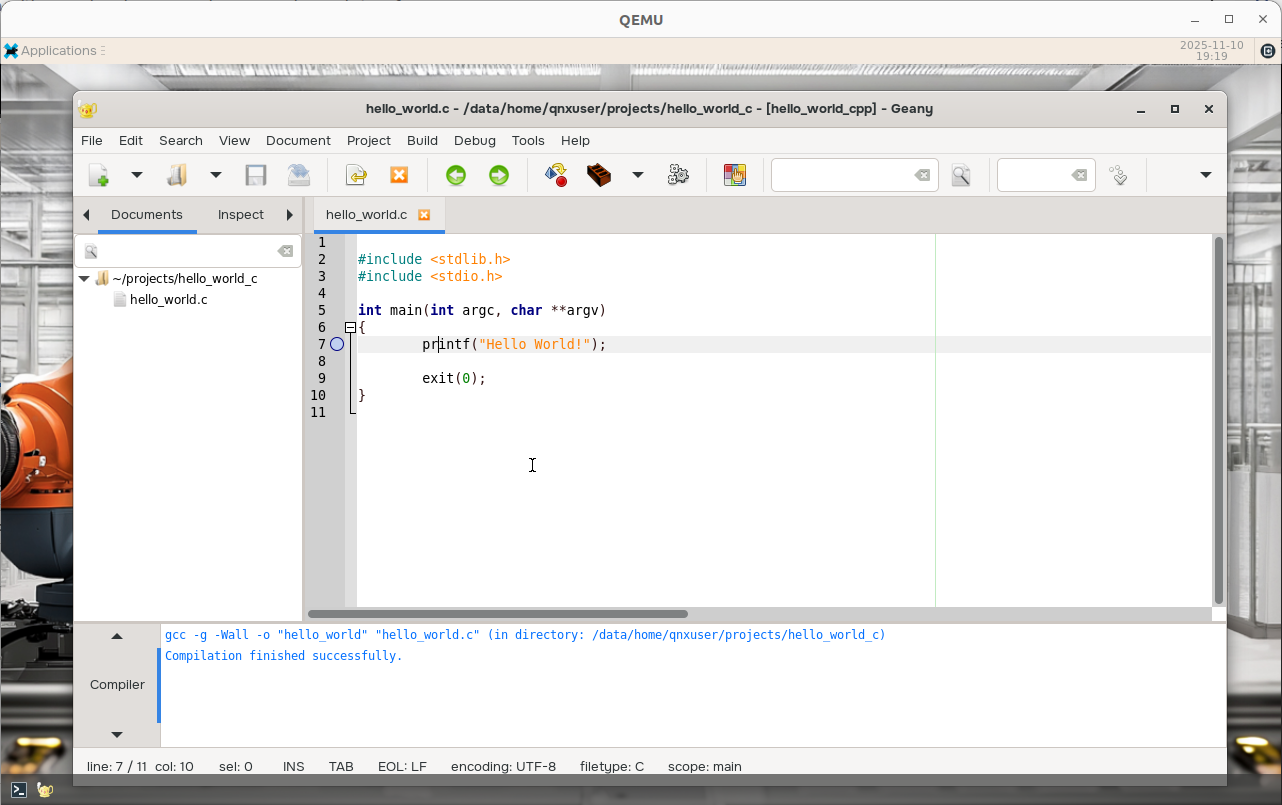 Write a Hello World sample application. Save it as hello_world.c:
