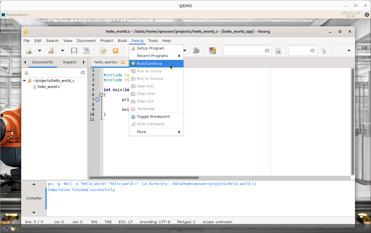 Select Debug > Run/Continue to run the debugger: