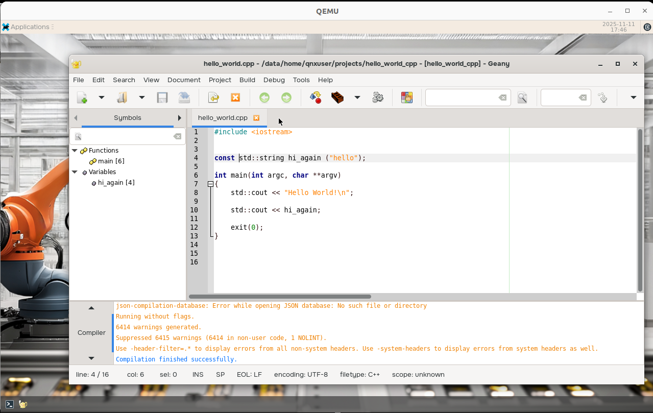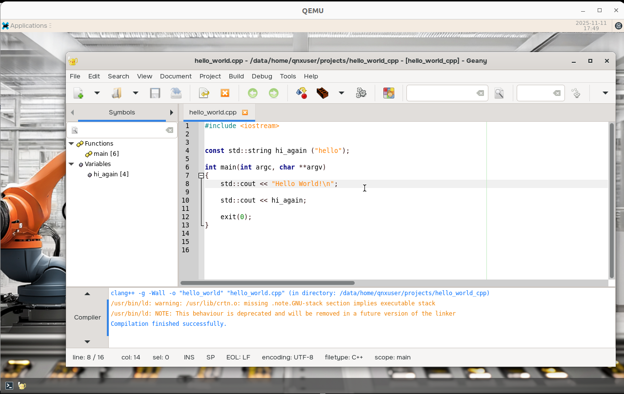 Write a Hello World sample application. Save it as hello_world.cpp: