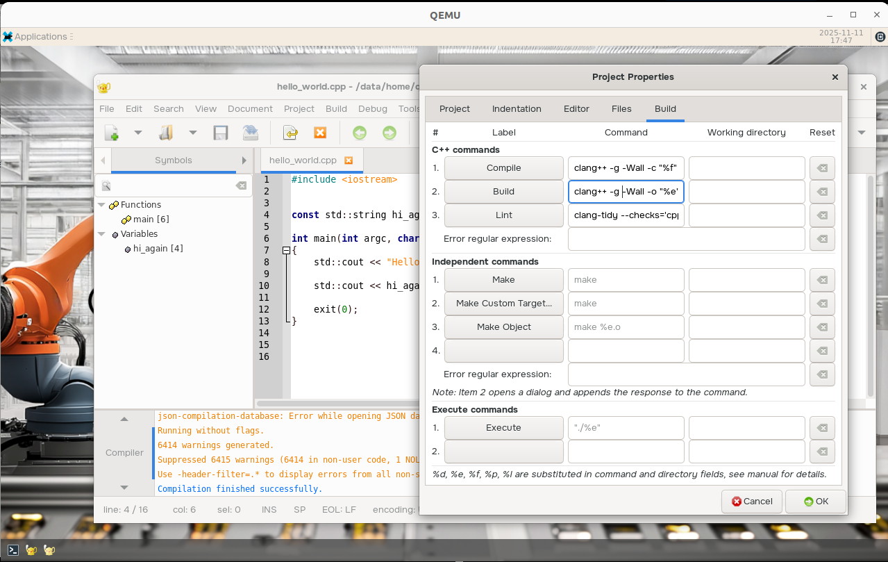 The default commands for C++ files are overriden for the user currently in /home/qnxuser/.config/geany/filedefs.