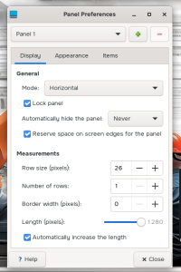 Customize XFCE4 panels, including the size, appearance, and items included. Currently, Panel 1 is the only panel, and it represents the configuration for the top taskbar containing the Applications menu and action buttons.