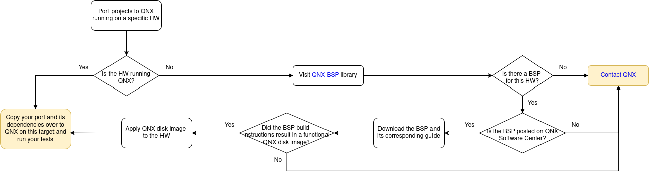 If you're interested in porting applications for a specific hardware, check to see if a QNX BSP for your platform is available. If it is, follow the setup instructions detailed in the corresponding BSP guide to build and apply it to your board. Once the BSP is successfully applied and your target hardware is booted with QNX, you can copy your port to the platform and run tests. The BSP guide should also tell you how to connect to the board.
